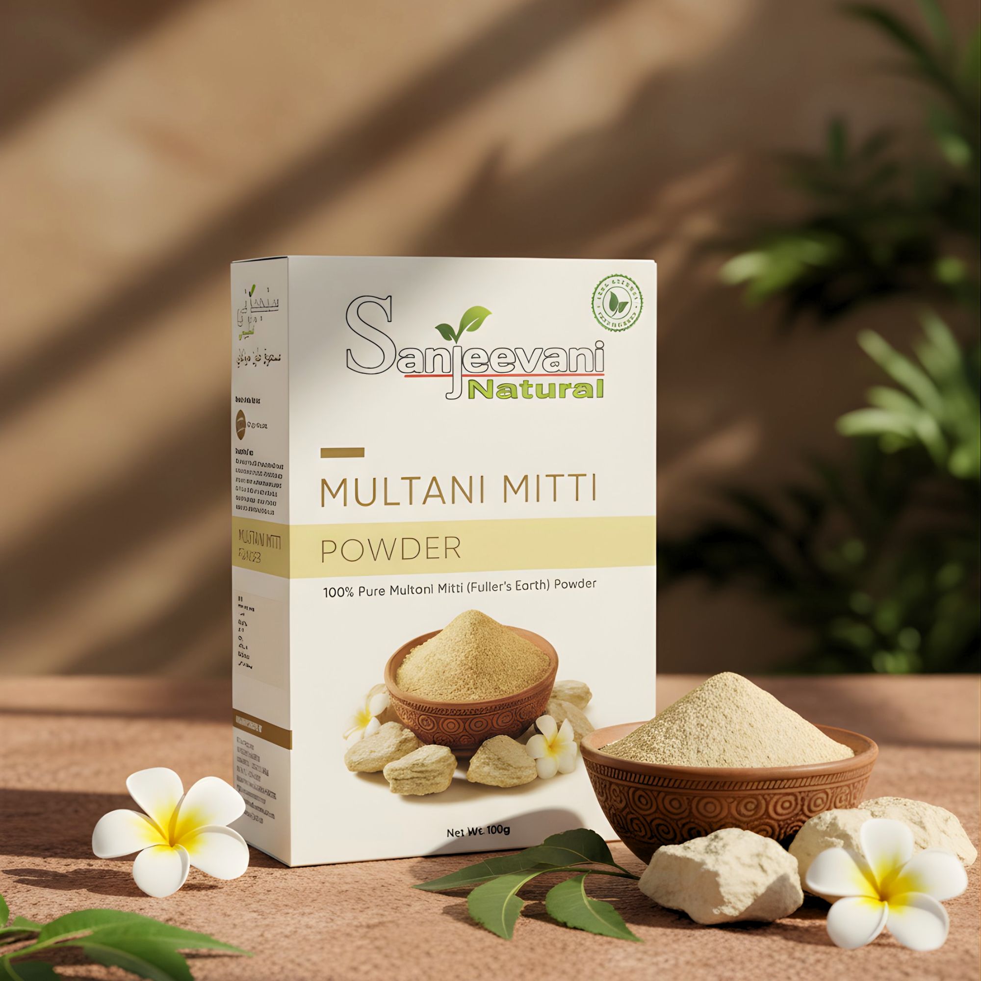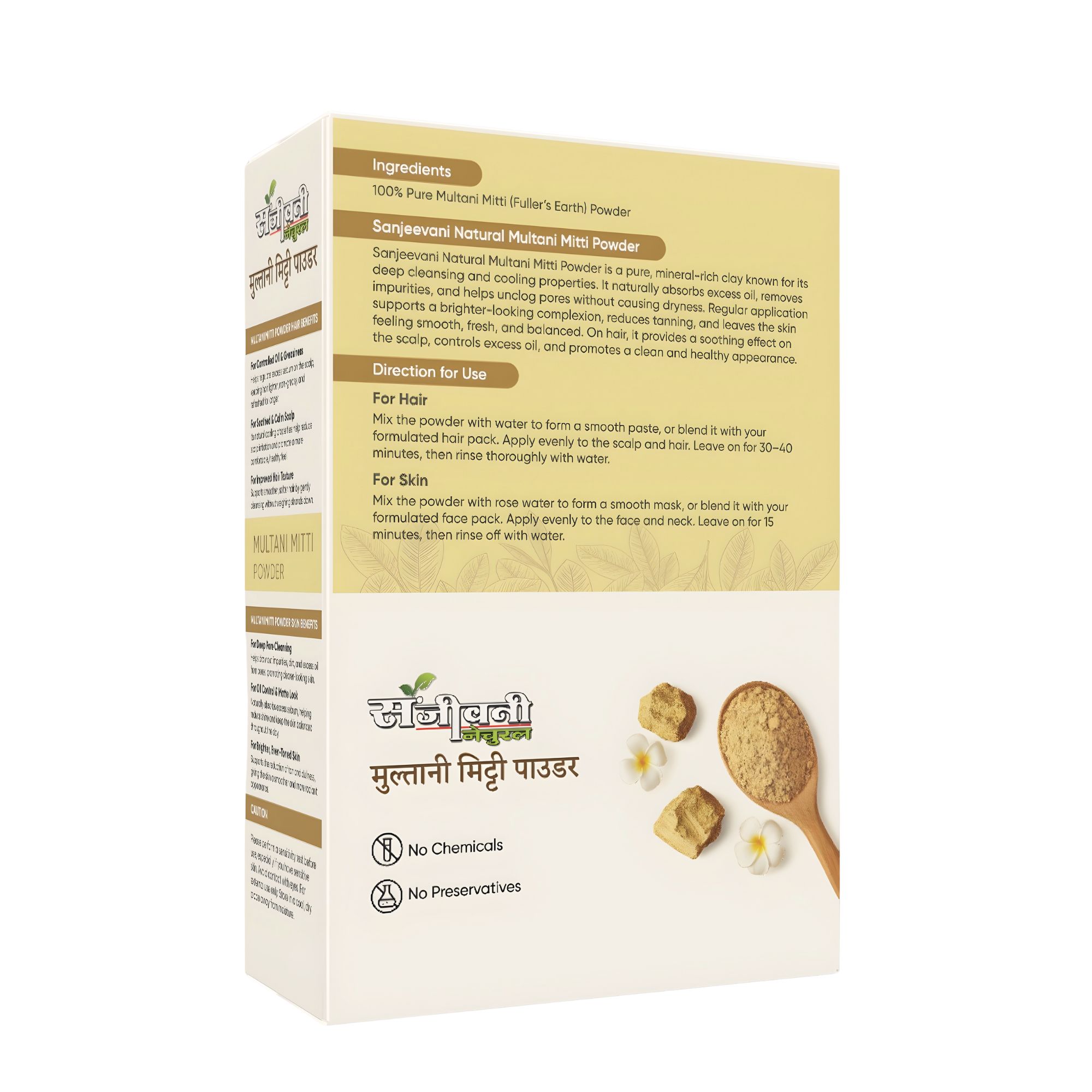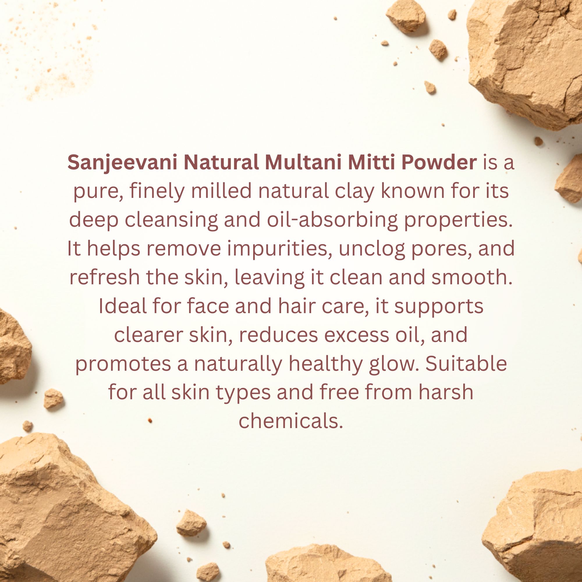 Sanjeevani Natural 100% Pure Multani Mitti Powder, a premium-grade, chemical-free natural clay. Known for its cooling and detoxifying properties, Multani Mitti helps cleanse pores, reduce excess oil, and rejuvenate dull skin. Itβs a versatile remedy for both face and hair care, leaving you with radiant skin and silky, nourished hair. Perfect for all skin types, this natural exfoliant is a must-have in your beauty routine.